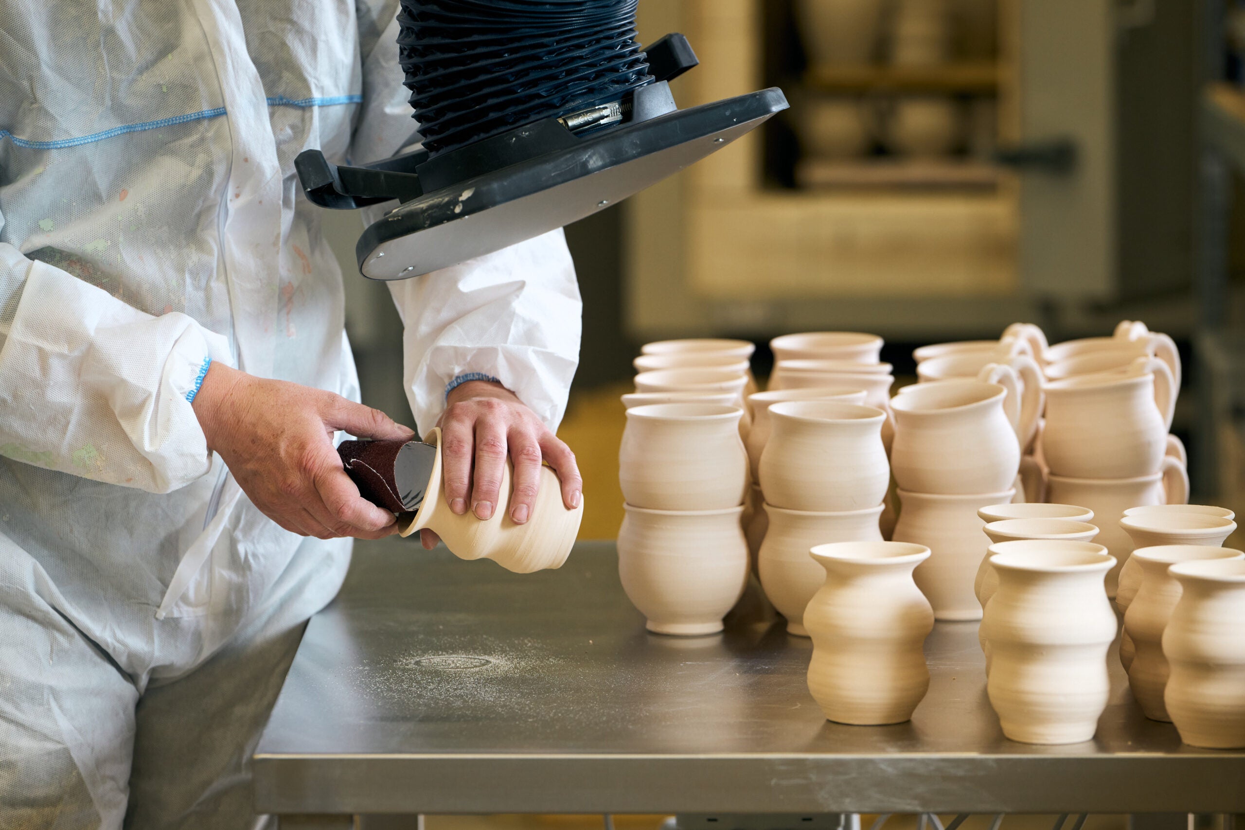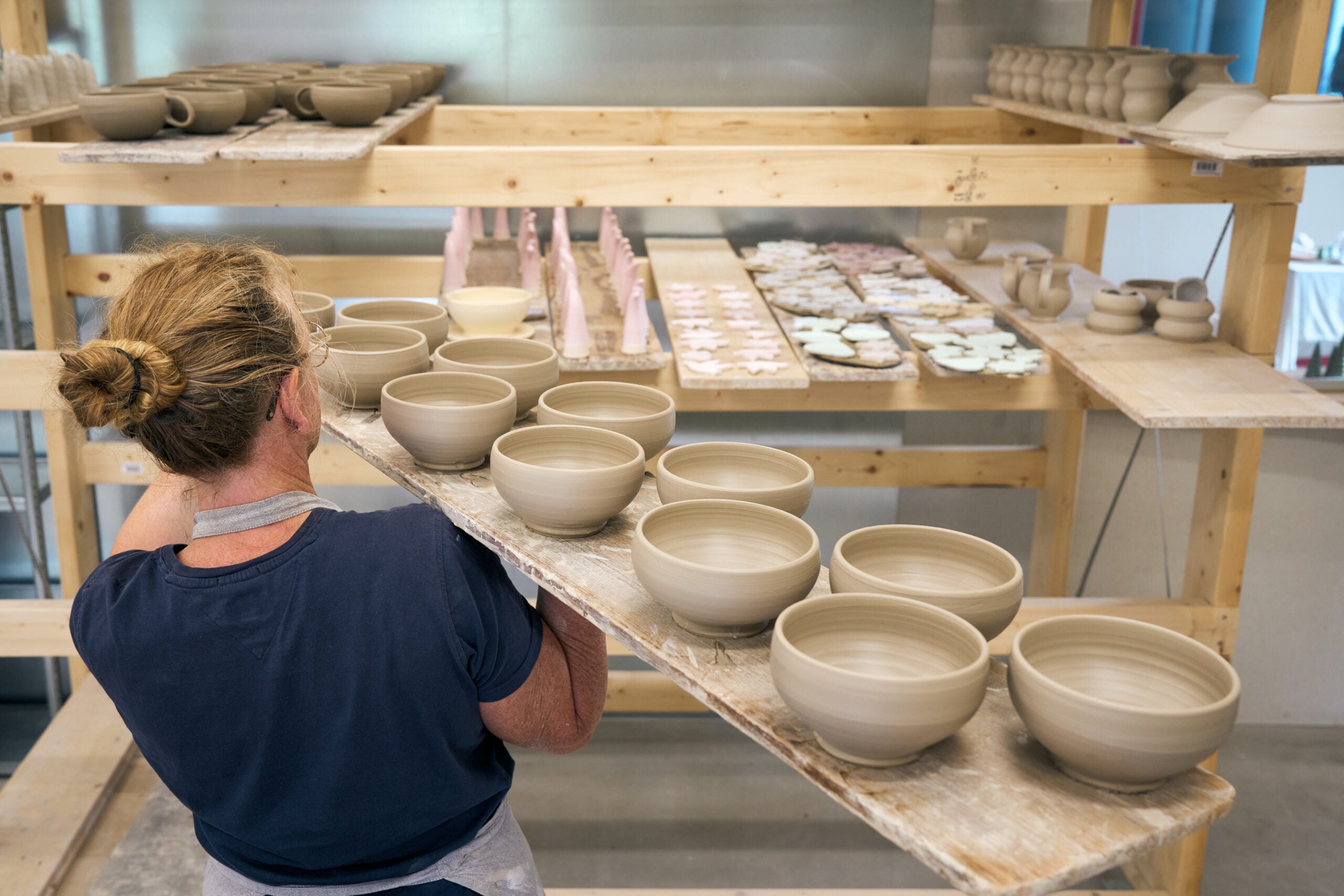 Bei Vangs engagieren wir uns für ESG. Wir haben eine ESG-Schulung absolviert. Auf dem Dach befinden sich Solarzellen und in den Glühbirnen LED-Leuchten. Unser Abwasser wird ein- bis zweimal gereinigt, bevor es in die Kanalisation eingeleitet wird. Ton und Glasur werden in sehr großen Mengen eingekauft, was wiederum weniger LKW-Transporte bedeutet. 95 % unserer Materialien werden auf Fünen gekauft, um die Transportwege so kurz wie möglich zu halten. Unser Abfall wird sortiert, und wir achten sehr darauf, in der Glasurphase keine Fehler zu machen, um zu viel Nachsortierung zu vermeiden. Unsere Öfen erzeugen die benötigte Wärme, sodass die Wärmepumpe fast nie läuft. Wir arbeiten derzeit daran, Glasuren mit krebserregenden Stoffen schrittweise abzuschaffen, um uns gegenseitig, aber auch die Umwelt zu schonen.